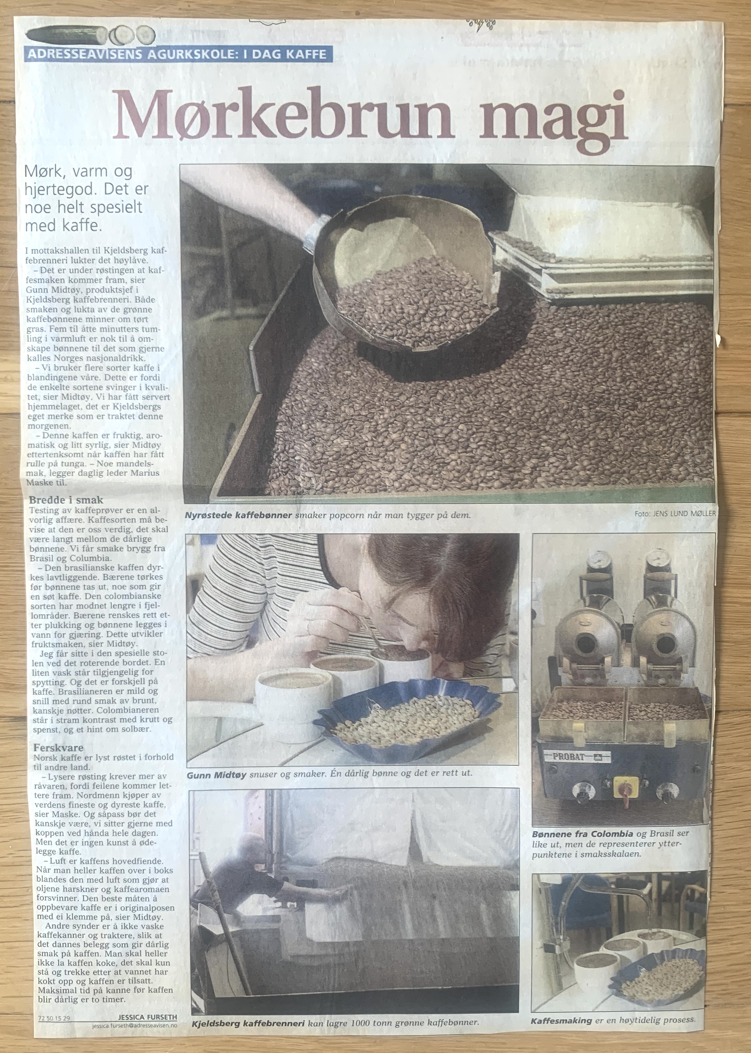 – Det er under røstinga at kaffesmaken kommer fram, sier Gunn Midtøy, produktsjef i Kjeldsberg kaffebrenneri. Både smaken og lukta av de grønne kaffebønnene minner om tørt gras. Fem til åtte minutter tumling i varmluft er nok til å omskape bønnene til det som gjerne kan kalles Norges nasjonaldrikk.