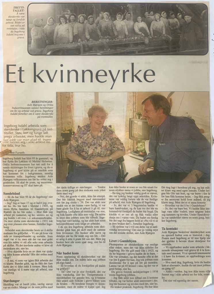 Ingeborg Isdahl er blitt 95 år gammel, og hun har flytta fra Løkken til Meldal Helsetun. Orkla Industrimuseum har tatt mål for å samle skildringer fra livet i gruva, og da er Ingeborg ei god kilde på et område som har kommet litt i bakgrunnen, nemlig kvinnenes rolle. Ingeborg ønsker museumsbestyrer Asle Bjørgen velkommen før hun setter seg i godstolen. Så skal de prate, og museumskonservatoren og ST-avisa skal høre på.