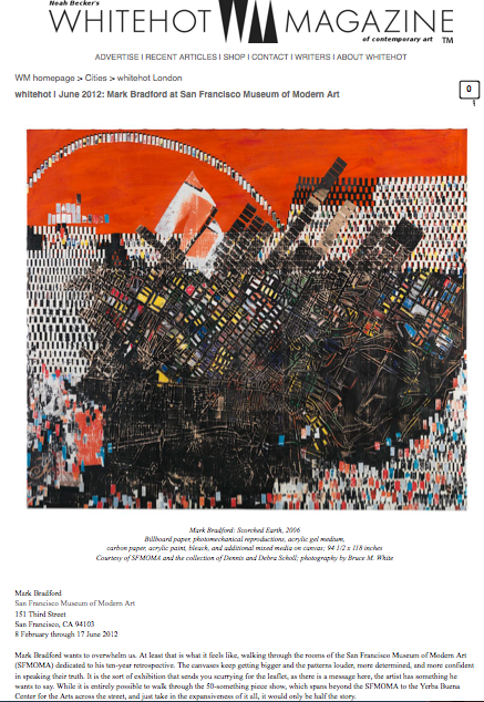 Mark Bradford wants to overwhelm us. At least that is what it feels like, walking through the rooms of the San Francisco Museum of Modern Art (SFMOMA) dedicated to his ten-year retrospective. The canvases keep getting bigger and the patterns louder, more determined, and more confident in speaking their truth. It is the sort of exhibition that sends you scurrying for the leaflet, as there is a message here, the artist has something he wants to say. While it is entirely possible to walk through the 50-something piece show, which spans beyond the SFMOMA to the Yerba Buena Center for the Arts across the street, and just take in the expansiveness of it all, it would only be half the story.
