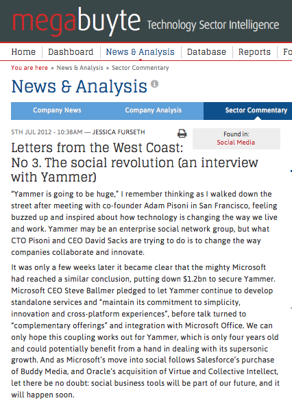 “Yammer is going to be huge,” I remember thinking as I walked down the street after meeting with co-founder Adam Pisoni in San Francisco, feeling buzzed up and inspired about how technology is changing the way we live and work. Yammer may be an enterprise social network group, but what CTO Pisoni and CEO David Sacks are trying to do is to change the way companies collaborate and innovate.