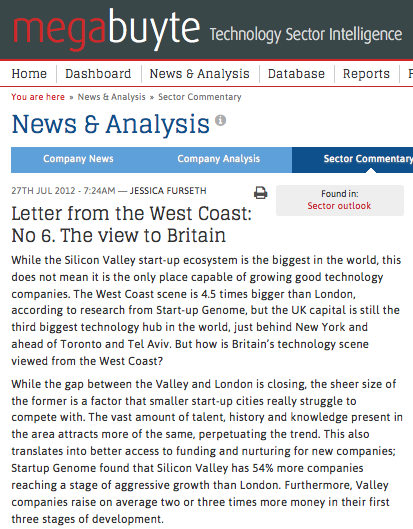 So while London, and the UK in general, is a different environment to Silicon Valley for operating a technology company, this does not necessarily mean it is inferior. While this is the last of the Letters from the West Coast, we are keen to further explore the UK startup scene; we are planning a spin around the Silicon Roundabout startup circuit to further explore how the UK is developing as a startup incubator. We will come back with ‘The Early View’ in the autumn.