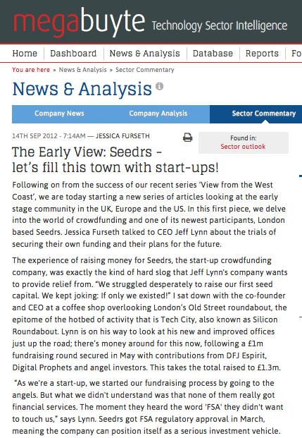 The experience of raising money for Seedrs, the startup crowdfunding company, was exactly the kind of hard slog that Jeff Lynn’s company wants to provide relief from. “We struggled desperately to raise our first seed capital. We kept joking: If only we existed!” I sat down with the co-founder and CEO at a coffee shop overlooking London’s Old Street roundabout, the epitome of the hotbed of activity that is Tech City, also known as Silicon Roundabout. Lynn is on his way to look at his new and improved offices just up the road; there’s money around for this now, following a £1m fundraising round secured in May with contributions from DFJ Espirit, Digital Prophets and angel investors. This takes the total raised to £1.3m.