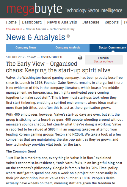 With 400 employees, however, Valve’s start-up days are over, but still the group is sticking to its boss-free guns. 400 people wheeling around without managers sounds chaotic, but clearly what they’re doing is working: Valve is reported to be valued at $893m in an ongoing takeover attempt from leading Korean gaming groups Nexon and NCSoft. We take a look at a few companies that are maintaining the start-up spirit as they’ve grown, and how technology provides vital tools for the task.
