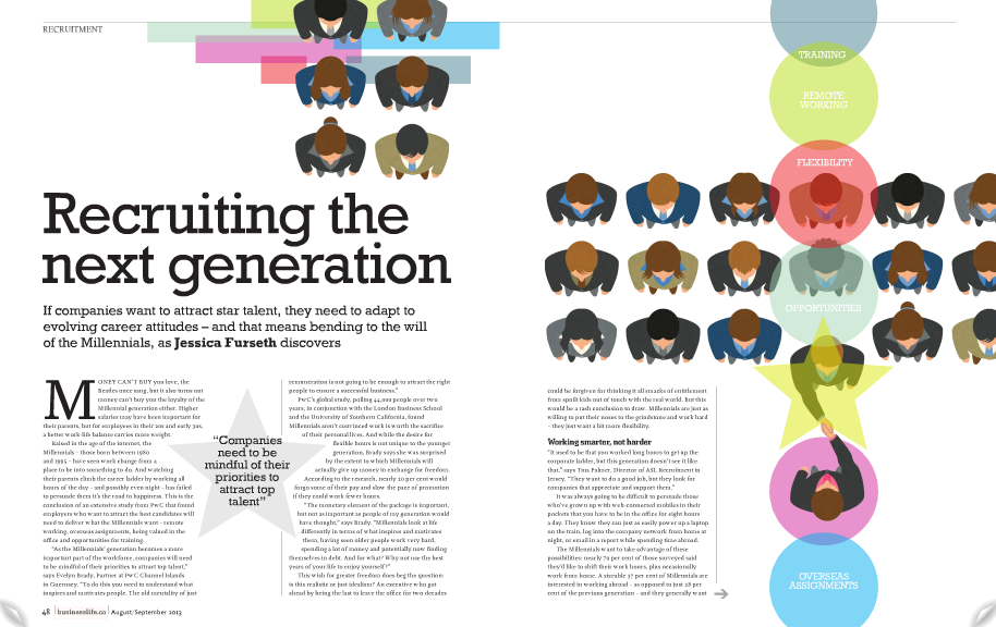 “The monetary element of the package is important, but not as important as people of my generation would have thought.” says Brady. “Millennials look at life differently in terms of what inspires and motivates them, having seen [older] people work very hard, spending a lot of money and potentially now finding themselves in debt. And for what? Why not use the best years of your life to enjoy yourself, instead of saving for the never-never days?”