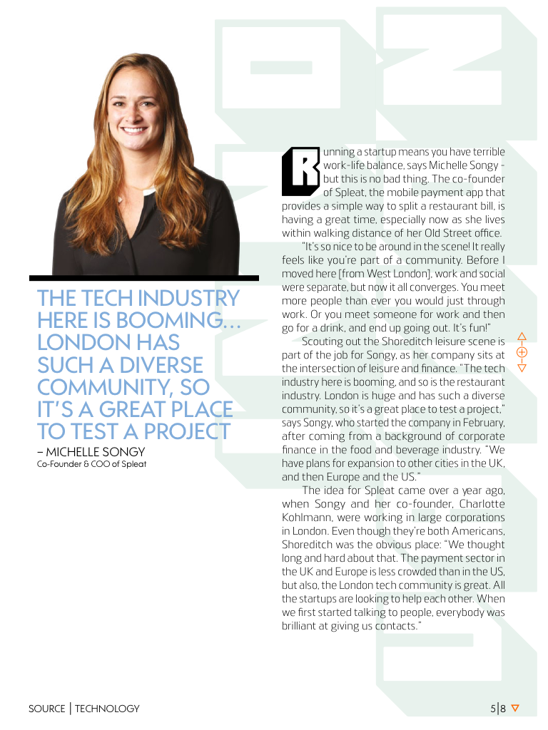 Running a startup means you have terrible work-life balance, says Michelle Songy – but this is no bad thing. The co-founder of Spleat, the mobile payment app that provides a simple way to split a restaurant bill, is having a great time, especially now as she lives within walking distance of her Old Street office.