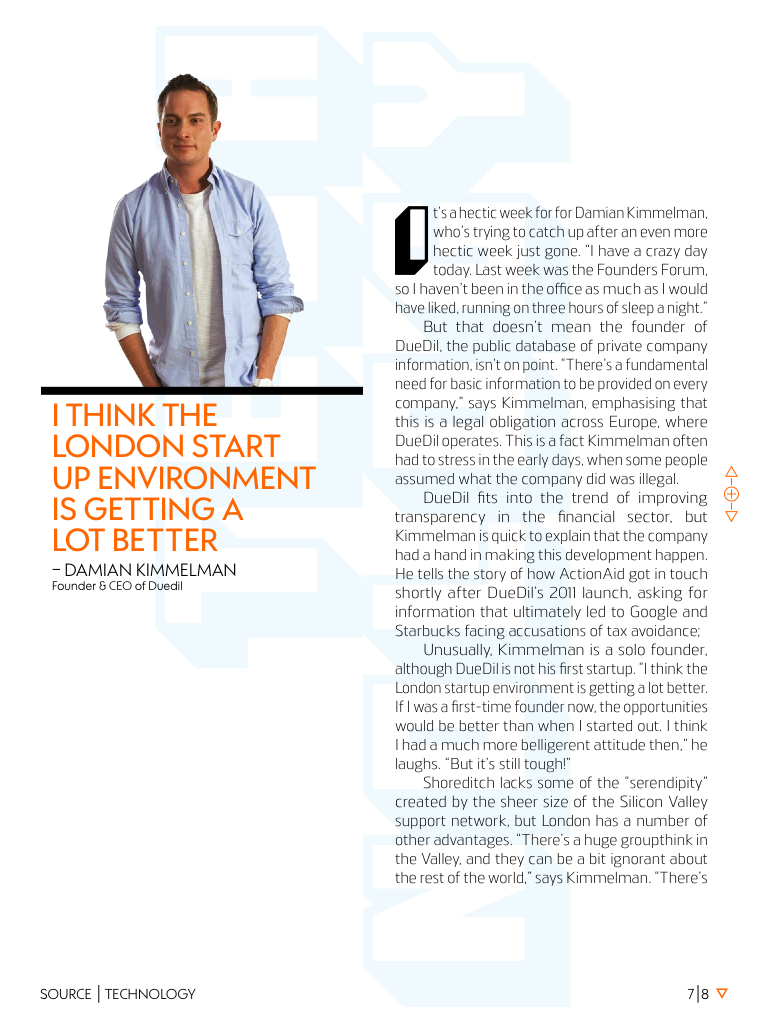 Unusually, Kimmelman is a solo founder, although DueDil is not his first startup. “I think the London startup environment is getting a lot better. If I were a first-time founder now, the opportunities would be better than when I started out. I think I had a much more belligerent attitude then,” he laughs. “But it’s still tough!”