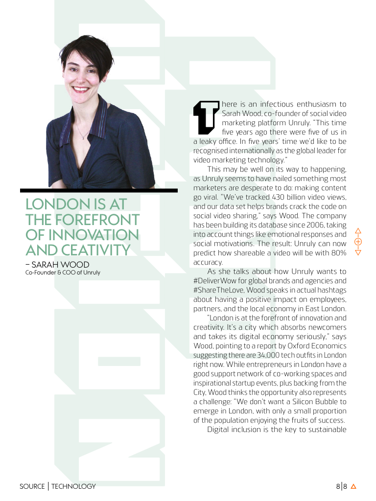 As she talks about how Unruly wants to #DeliverWow for global brands and agencies and #ShareTheLove, Wood speaks in actual hastags about having a positive impact on employees, partners, and the local economy in East London. “London is at the forefront of innovation and creativity. It’s a city which absorbs newcomers and takes its digital economy seriously,” says Wood, pointing to a report by Oxford Economics suggesting there are 34,000 tech outfits in London right now.