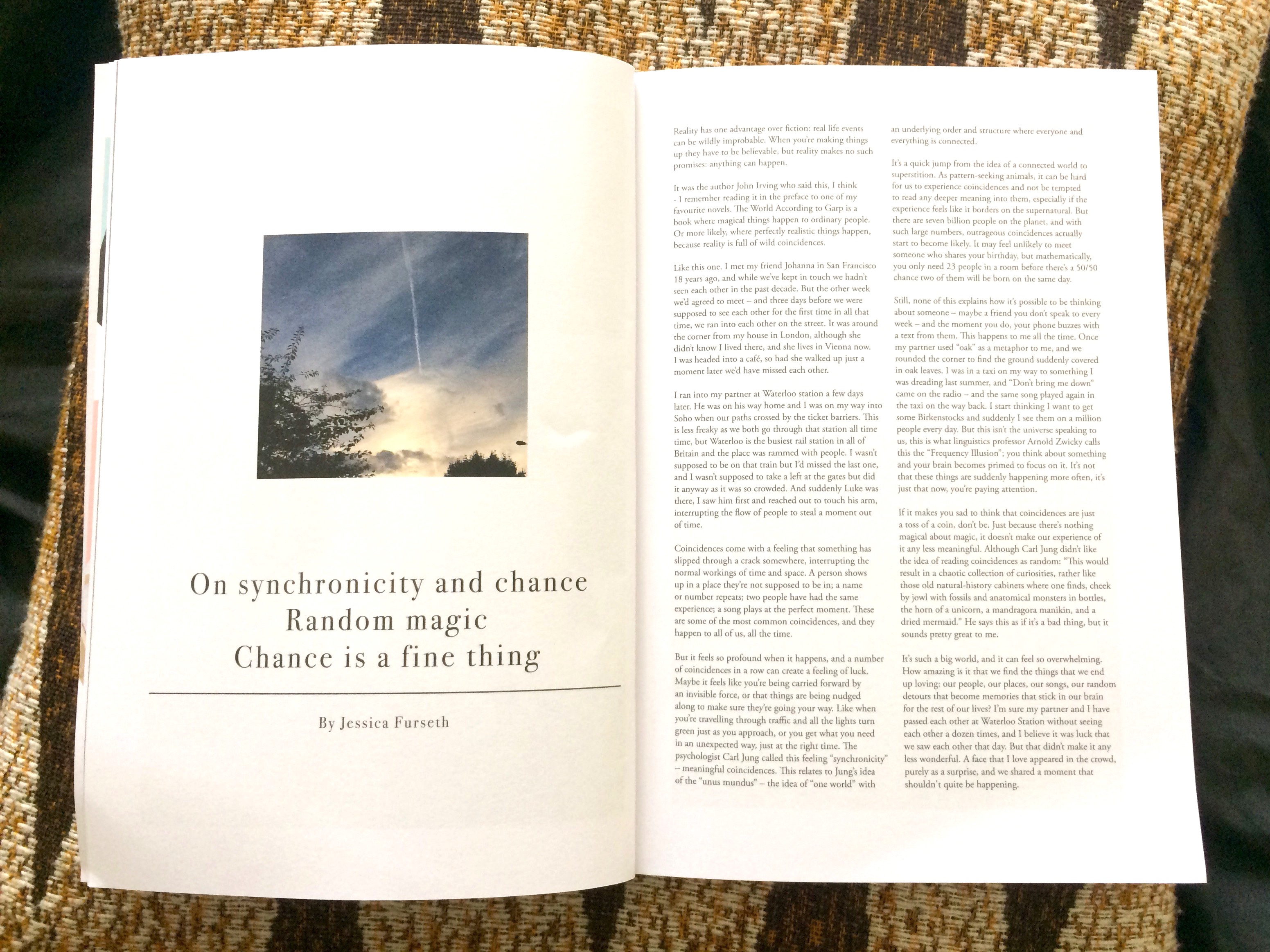 Like this one. I met my friend Johanna in San Francisco 18 years ago, and while we’ve kept in touch we hadn’t seen each other in the past decade. But the other week we’d agreed to meet – and three days before we were supposed to see each other for the first time in all that time, we ran into each other on the street. It was around the corner from my house in London, although she didn’t know I lived there, and she lives in Vienna now. I was headed into a café, so had she walked up just a moment later we’d have missed each other.