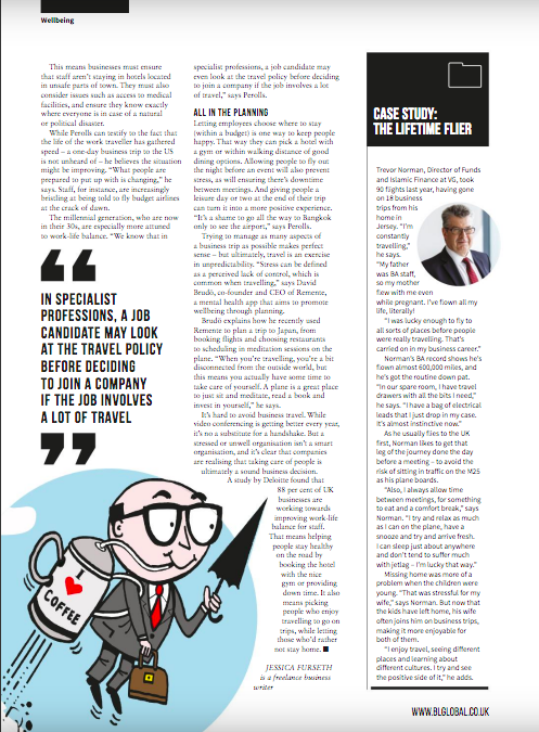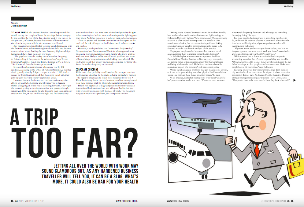 Dr Bob Gallagher, who heads up occupational health at Queens Road Medical Practice in Guernsey, says that companies are getting better at taking responsibility for their employees’ well-being while on the road. The issue should be considered as part of a company’s risk assessment: “Work travel can cause problems that can make people unwell, or it can make pre-existing mental or physical health conditions worse – or both, as these things are often linked,” says Gallagher. At his practice, Gallagher meets people who travel “an awful lot”, sometimes for weeks at a time. “It’s rare to meet someone who travels often for work who says it’s something they enjoy doing,” says Gallagher – for most people it’s something they have to do for the job and it can be a source of stress.