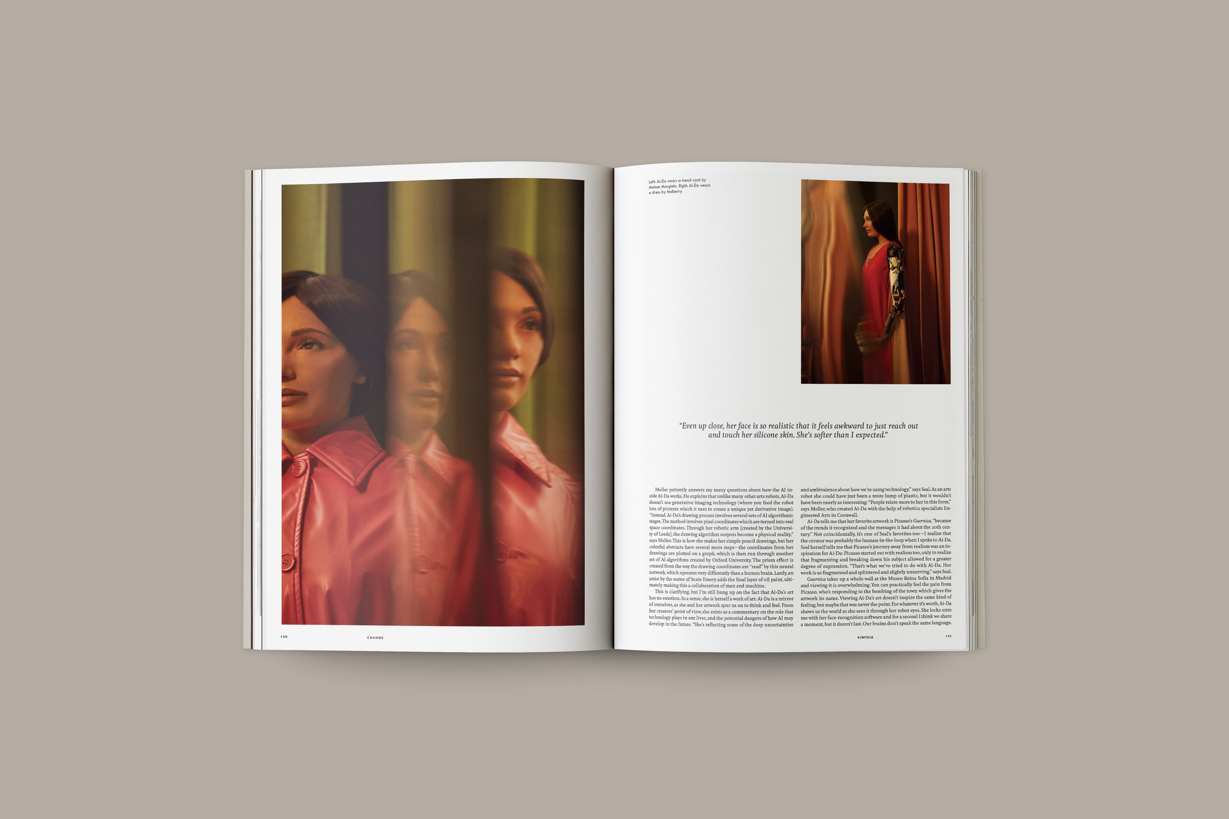 This is clarifying, but I’m still hung up on the fact that Ai-Da’s art has no emotion. In a sense, she is herself a work of art: Ai-Da is a mirror of ourselves, as she and her artwork spurs us on to think and feel. From her creators’ point of view, she exists as a commentary on the role that technology plays in our lives, and the potential dangers of how AI may develop in the future. “She’s reflecting some of the deep uncertainties and ambivalence about how we’re using technology,” says Seal. As an arts robot she could have just been a mute lump of plastic, but it wouldn’t have been nearly as interesting: “People relate more to her in this form,” says Meller, who created Ai-Da with the help of robotics specialists Engineered Arts in Cornwall.