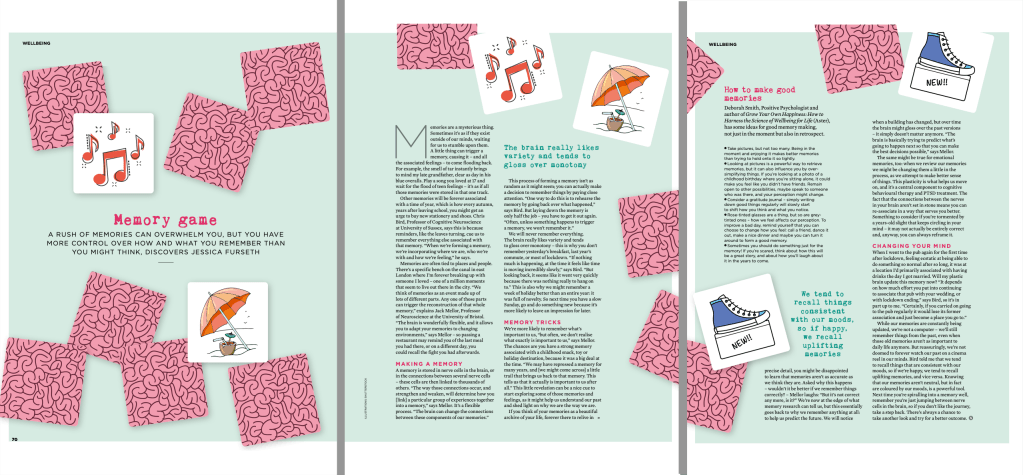 While my memories are constantly being updated, I’m not a computer – I’ll still remember things from the past, even as things change those old memories aren’t as important to my daily life anymore. But reassuringly, we’re not doomed to forever watch our past on a cinema reel in our minds. Bird told me that we tend to recall things that are consistent with our moods, so if I’m happy I tend to recall uplifting memories, and vice versa. Knowing that our memories aren’t neutral, but in fact are coloured by our moods, is a powerful tool: next time you’re spiralling into a memory well, remember it’s not necessarily accurate. You’re just jumping between nerve cells in the brain, so if you don’t like the journey, take a step back. There’s always a chance to take another look at the past and try for a better outcome.