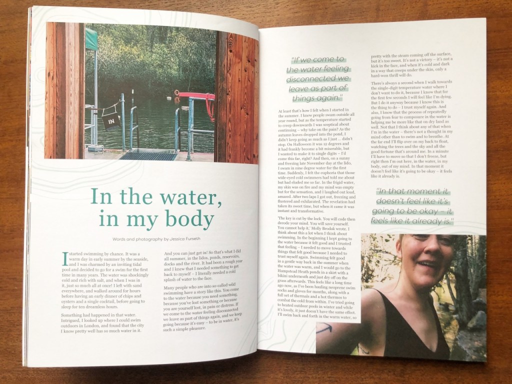 Something had happened in that water. Intrigued, I looked up where I could swim outdoors in London, and found that the city I know pretty well has so much water in it. And you can just get in! So that’s what I did all summer, in the lidos, ponds, reservoirs, docks and the river. It had been a rough year and I knew that I needed something to get back to myself – I literally needed a cold splash of water to the face.