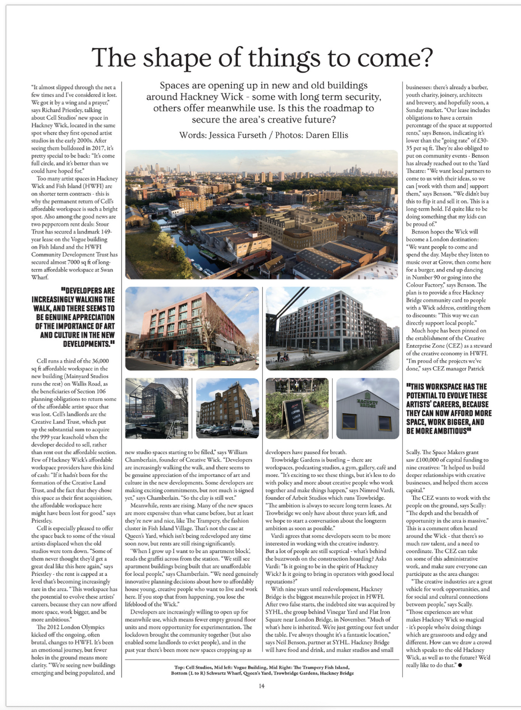 Too many artist spaces in Hackney Wick and Fish Island (HWFI) are on shorter term contracts – this is why the permanent return of Cell’s affordable workspace is such a bright spot. Also among the good news are two peppercorn rent deals: Stour has secured a landmark 149-year lease on the Vogue building on Fish Island, the HWFI Community Development Trust has secured almost 7000 sq ft of long-term affordable workspace space at Swan Wharf.