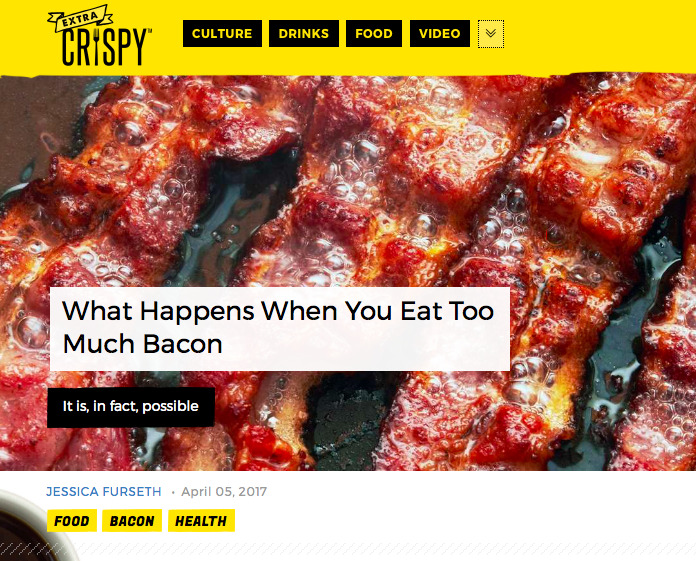 Luke still loves bacon, but he’s no longer so cavalier with portion sizes. Because yes, says Luke, there’s definitely such a thing as too much bacon: “I call it the Gout Line. I don’t know where my Gout Line is, and I’m unwilling to do the studies to find it. I’d say that for me, it’s somewhere between 20 and 100 strips of bacon.”