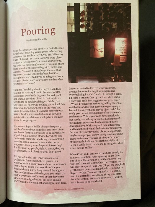 I never expected to like red wine this much. I remember once finding it so pungent and overwhelming I couldn’t make it through a glass. I’d come a little further by the time when Chris, a few years back, first suggested we go to Sager + Wilde. I remember hesitating, telling him, “I’m not that into wine,” but agreeing to go anyway – he said it was great, and maybe I just hadn’t had really good wine? Good quality often transcends preferences. This is years ago now, and slowly but surely, something incredible has happened: my hesitant enjoyment has blossomed into a deranged love. With deep and rich, interesting and fantastic red wine I feel a similar intensity to the way I love my favourite places, and possibly, maybe even people. I know barely anything about grape varieties or vintages or vineyards or any of those technicalities, but all those nights at Sager + Wilde have trained me to recognise when something is brilliant.